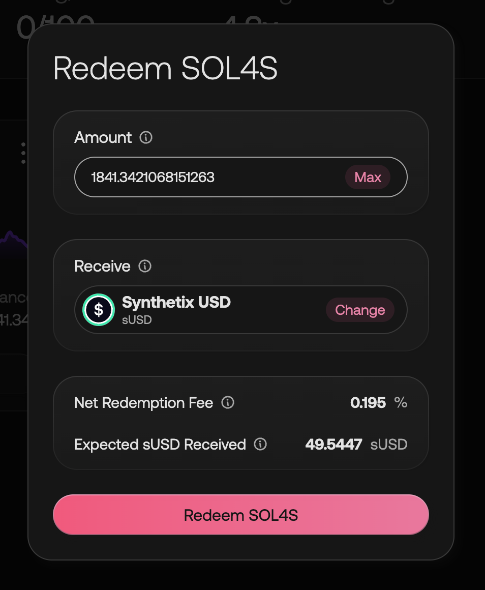The `Expected sUSD Received` corresponds to the 21,249.74 SOL4S, the maximum amount that can be redeemed in a single transaction, NOT the input amount of 23,091 SOL4S.&#x20;