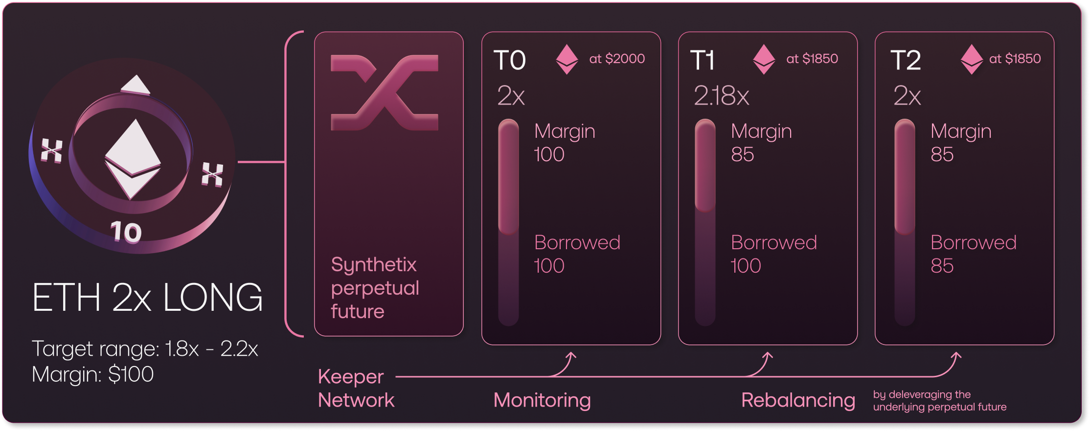 Fig. 2 illustrates a rebalancing event of an ETH 2x LONG token. The decline in ETH price by 7.5% from T0 to T1 leads to a 15% reduction in the margin. As a result, the leverage factor rises to 2.18x, approaching the upper limit of the target range. The keeper network detects this deviation and initiates the rebalancing event, reducing the borrowed funds by 15%. This rebalances the margin-to-notional ratio, thus resetting the leverage factor to 2x.